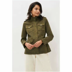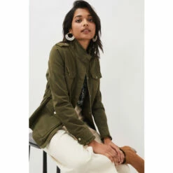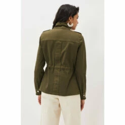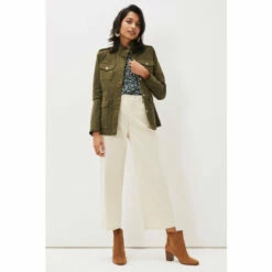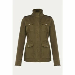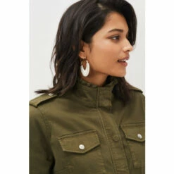 Give your new-season wardrobe a contemporary edge with their khaki utility jacket. Designed with patch pockets, epaulets and a high neckline accented with frill detailing for a feminine finish. Wear it buttoned up or open over your looks for an effortless take on layering.