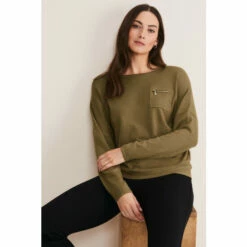 A must-have top for your everyday wardrobe. Designed in a versatile olive shade, our long-sleeve top features dropped shoulders and zip detailing. We wear ours with black trousers for a casual everyday look. This style is responsibly sourced. This style has been made from certified renewable wood sources. LENZING™ ECOVERO™ viscose uses a responsible production process, generating up to 50% lower emissions and water impact than generic viscose. LENZING™ ECOVERO™ are trademarks of Lenzing AG.