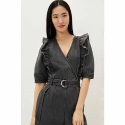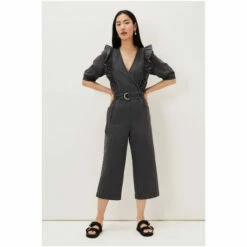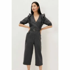 Achieve standout-style with our modern Flora jumpsuit. Designed with a flattering V-neckline, it features frills that decorate the clean lines down from the shoulder to the waist, which is cinched by a chic belt and the silhouette then falls to a flattering cropped wide leg. This is an effortlessly luxe style – pair with either sandals or boots, depending on the occasion.