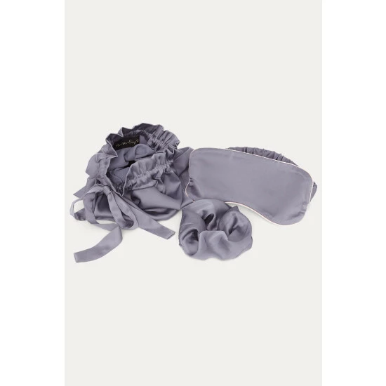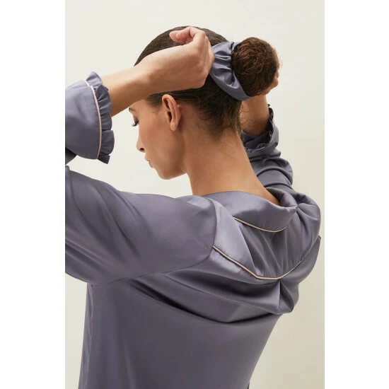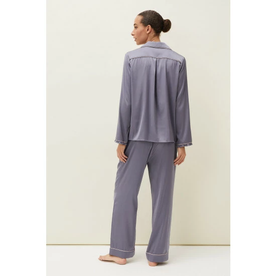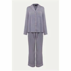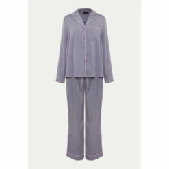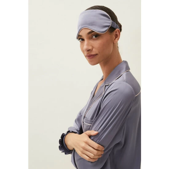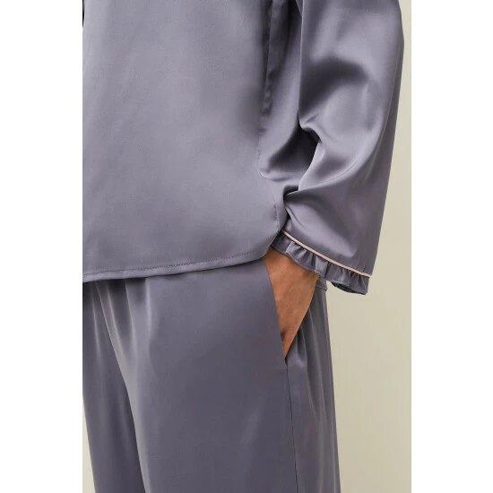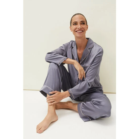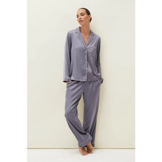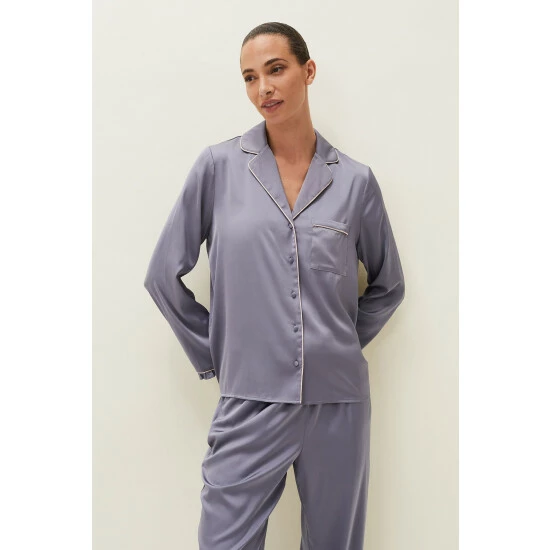 Our Shae pyjama set features a shirt and wide leg trouse, designed from a soft satin-like fabric with contrast piping. The shirt features notch lapels, patch pocket and frill detailing on the sleeve cuffs. All of our pyjama styles come with a matching eye-mask and scrunchie in a self-tie bag. Available up to size 26. || Model wears UK Size 10 and is 5’9″/180cm
