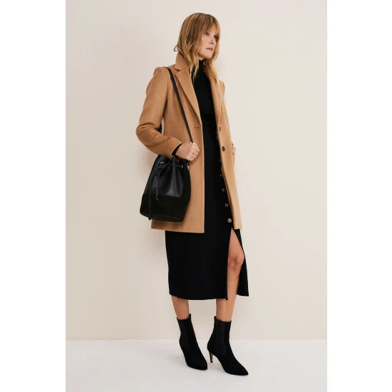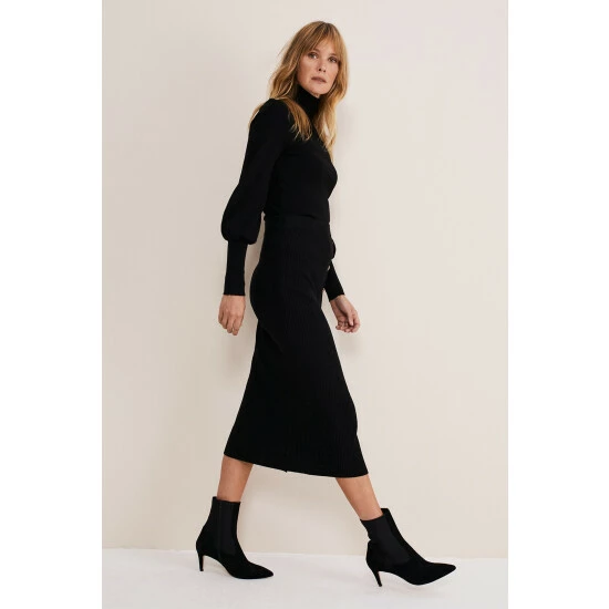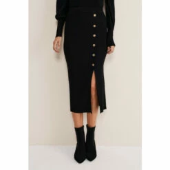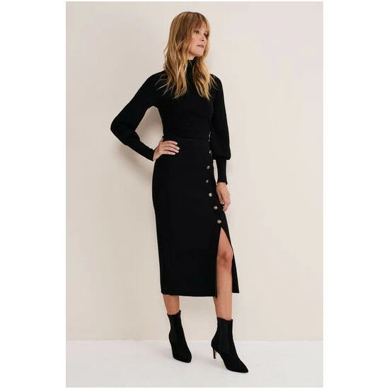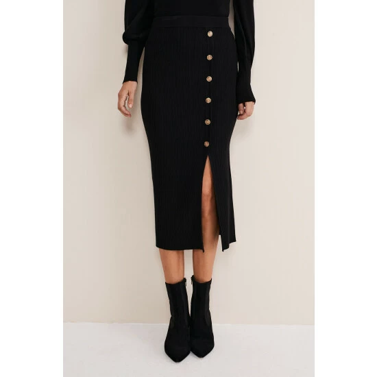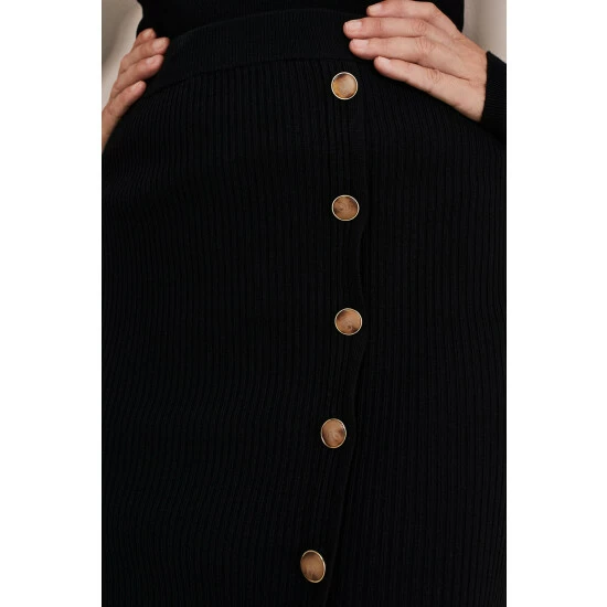 Add this versatile style to your everyday wardrobe. Our Irena knitted skirt features contrast tortoiseshell buttons and a front slit. We wear ours with a black balloon knit jumper and black boots.