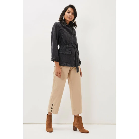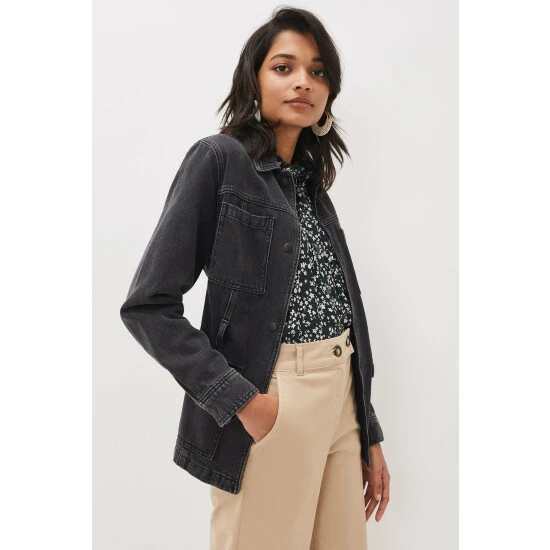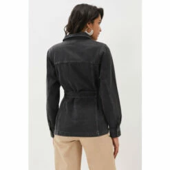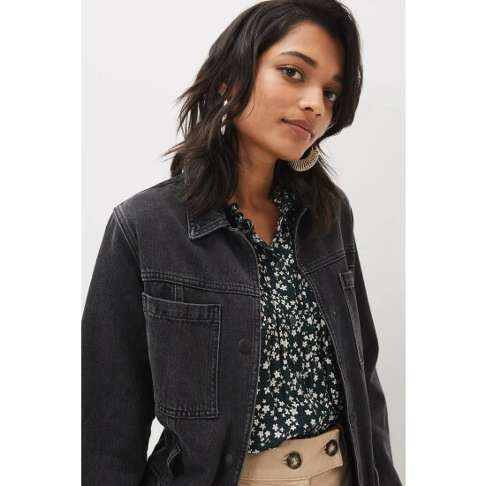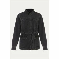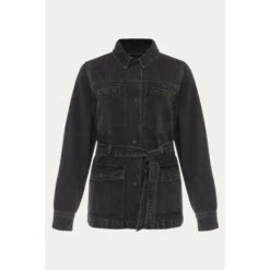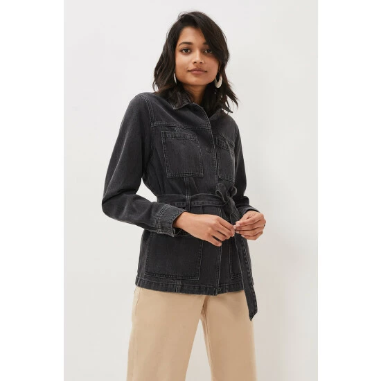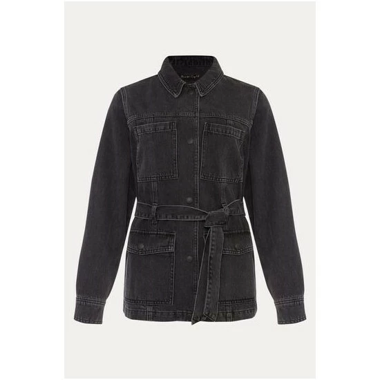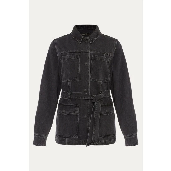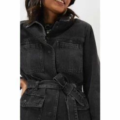 A brand new style for us. This denim shacket embraces the current utility trend with it s washed black shade, button and seam details and patch pockets. Finished with a classic Kent collar and matching adjustable waist tie to highlight your silhouette.