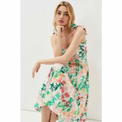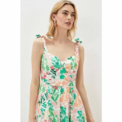 A stunning floral dress that’s perfect for weddings and garden parties alike. Designed with a feminine sweetheart neckline and adjustable tie straps, the fitted bodice falls to a flowing, pleated silhouette. Just add a fascinater and clutch for perfect wedding guest style.