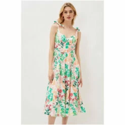 A stunning floral dress that’s perfect for weddings and garden parties alike. Designed with a feminine sweetheart neckline and adjustable tie straps, the fitted bodice falls to a flowing, pleated silhouette. Just add a fascinater and clutch for perfect wedding guest style.