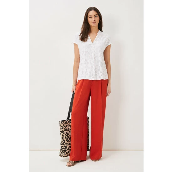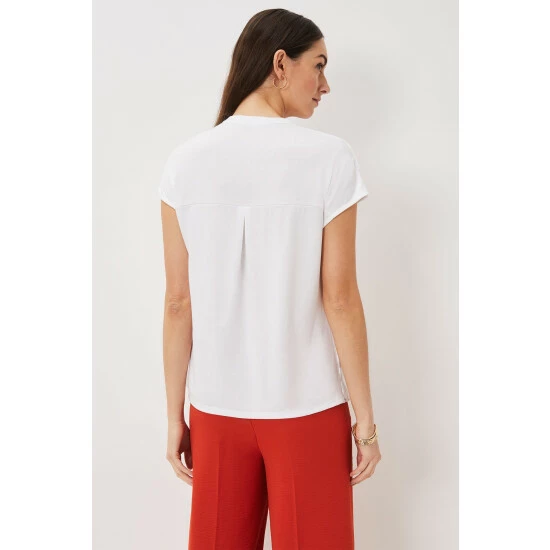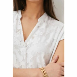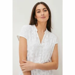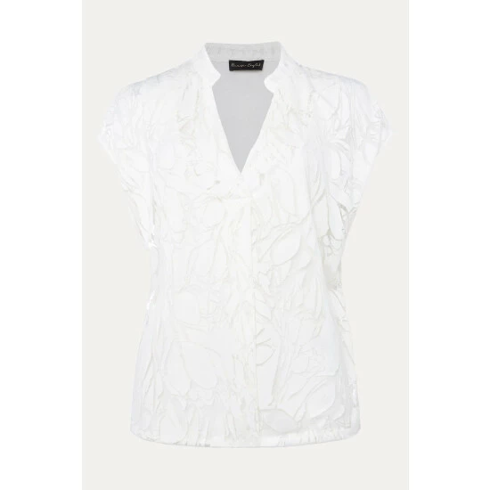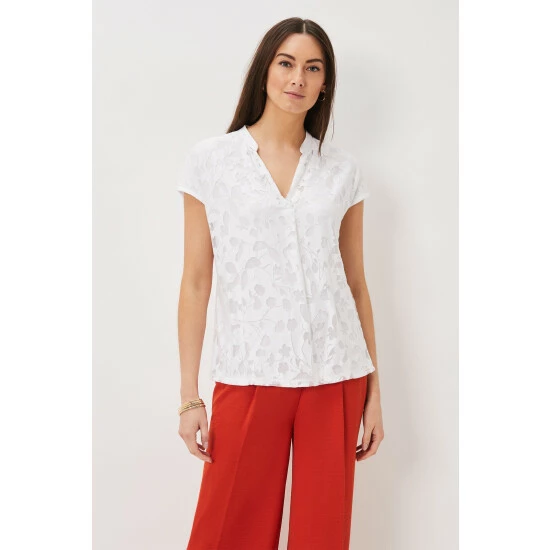 A staple top, with a twist. The white top features short sleeves, a notched neckline and an all over burnout floral print. This style looks great when paired with jeans. Part of their Sustainably Sourced Collection. This style has been made from certified renewable wood sources. LENZING; ECOVERO; viscose uses a responsible production process, generating up to 50% lower emissions and water impact than generic viscose.