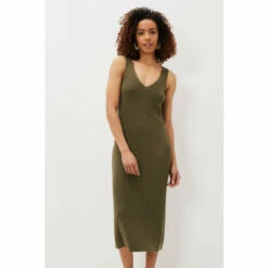 Every woman’s wardrobe needs a stunning ribbed dress. Designed in a versatile green colour, this slim fit ribbed dress has a feminine V-neckline and comes to a midi length. It’s perfect to slip on with sandals and layer on a denim jacket.