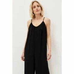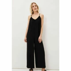 This soft jumpsuit is perfect for those days where you want something comfortable to run errands or lounge around in. This relaxed fit has a flattering V-neck, thin, adjustable straps and a flattering wide leg silhouette. They would be wearing this with sandals and trainers, all season long. Part of their Sustainably Sourced Collection. This style has been made from certified renewable wood sources. LENZING; ECOVERO; viscose uses a responsible production process, generating up to 50% lower emissions and water impact than generic viscose.