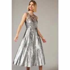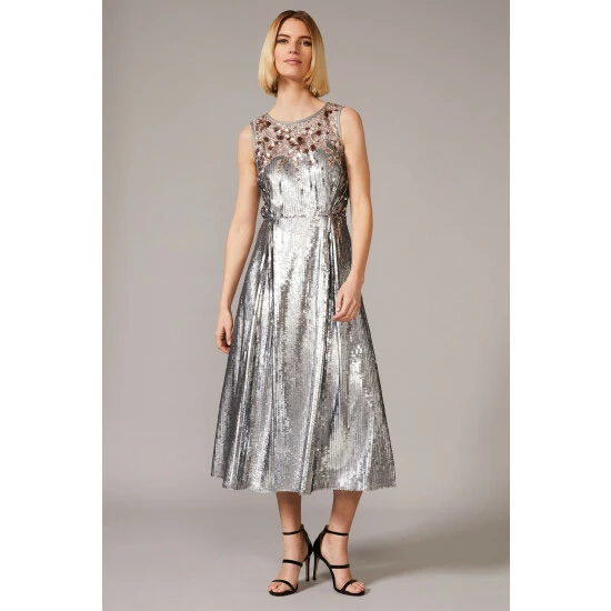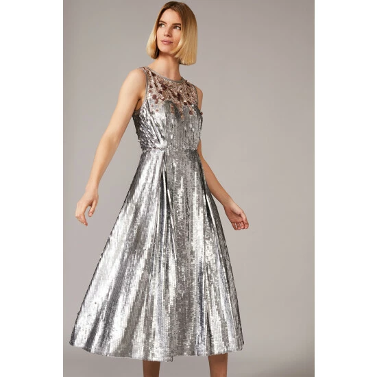 From Collection 8, Phase Eight’s stunning range of premium evening dresses. Need a statement dress for an upcoming party or special event? Look to the Lainey style, cut to a modern midi length, it is fully sequinned, graduating from blush embellishment through to shimmering silver. The satin-trimmed bodice is gathered and the skirt is gently pleated to nip in the waist, to highlight your silhouette.