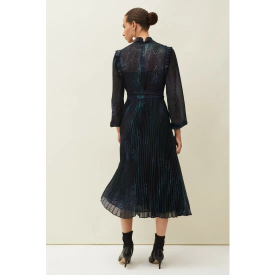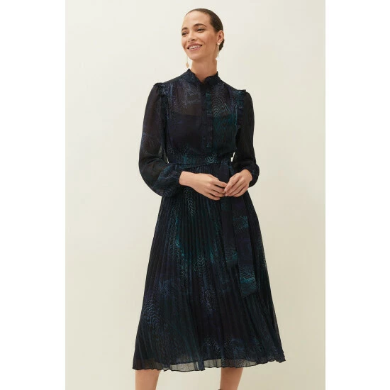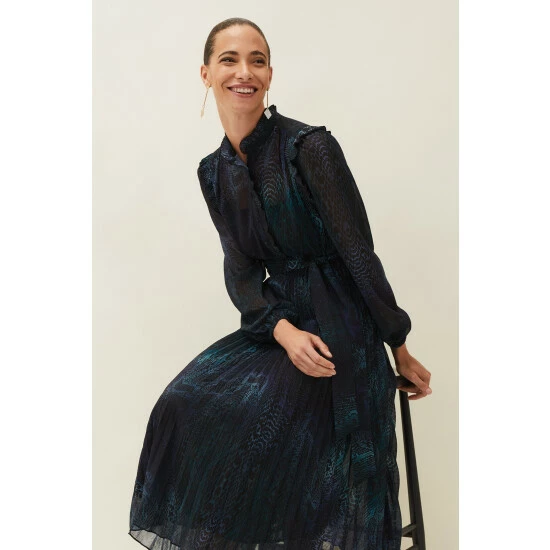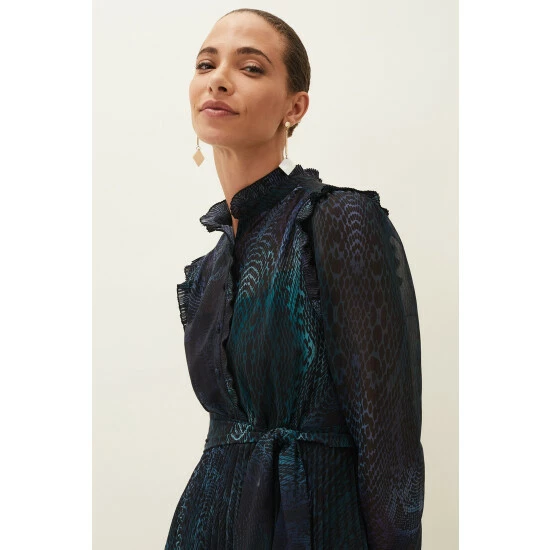 Part of Phase Eight’s Sustainably Sourced Collection. This style has been made from recycled polyester, giving materials that would have ended up in landfill a new lease of life. A snakeskin print and pleated skirt makes this dress an impactful style to add to your day-to-night wardrobe this season. Framed by long blouson sleeves and an adjustable waist tie.