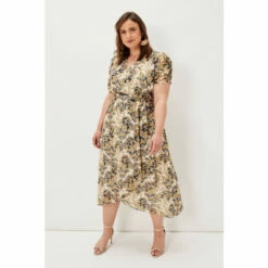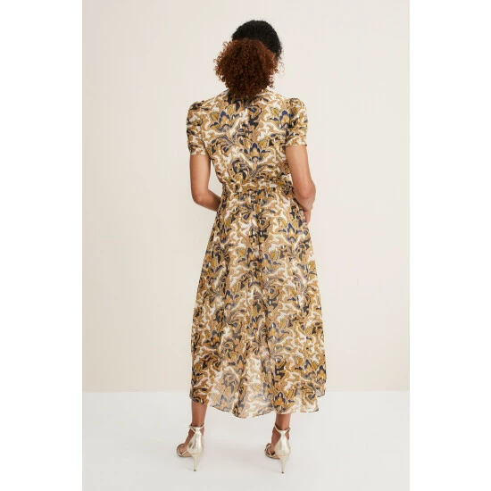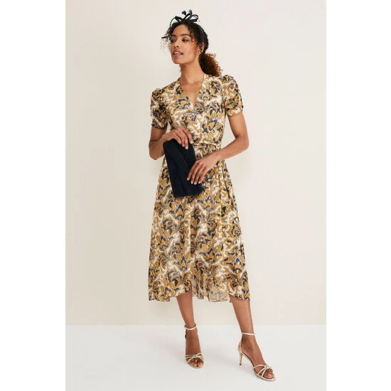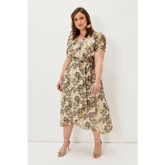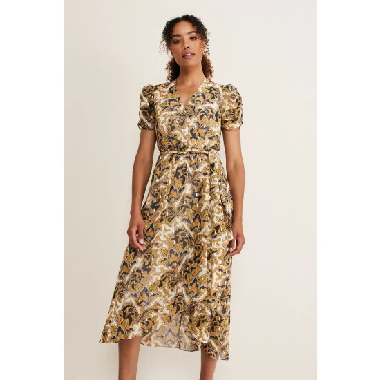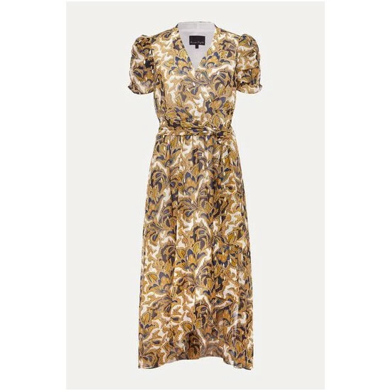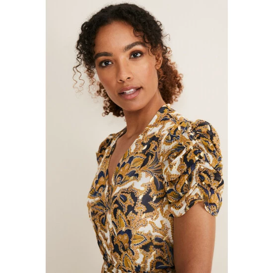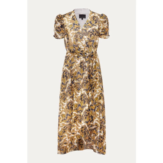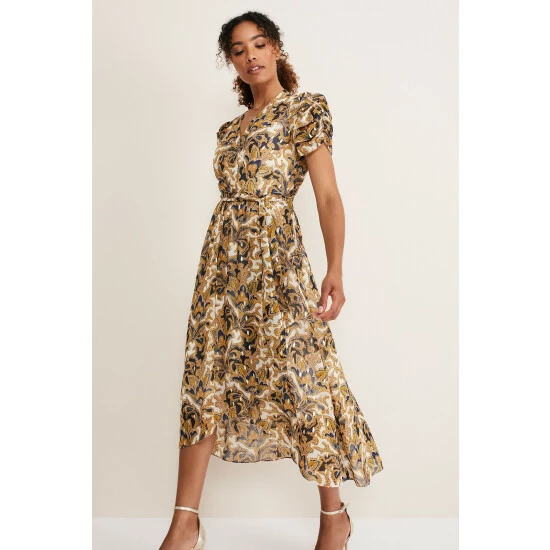 This beautiful occasion dress is on all of our wish lists. Designed with a vintage pattern in shades of navy, gold and white, our Floriana dress features a wrap-style bodice, short sleeves and falls to a loose silhouette with an asymmetric hem. Wear with heels to your next special event or dress down with sandals or trainers for a stunning evening look. This style is responsibly sourced. This style has been made from recycled polyester, giving materials that would have ended up in landfill a new lease of life.