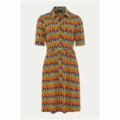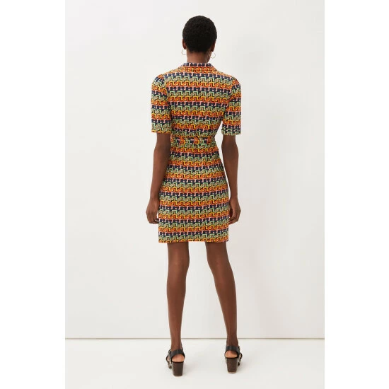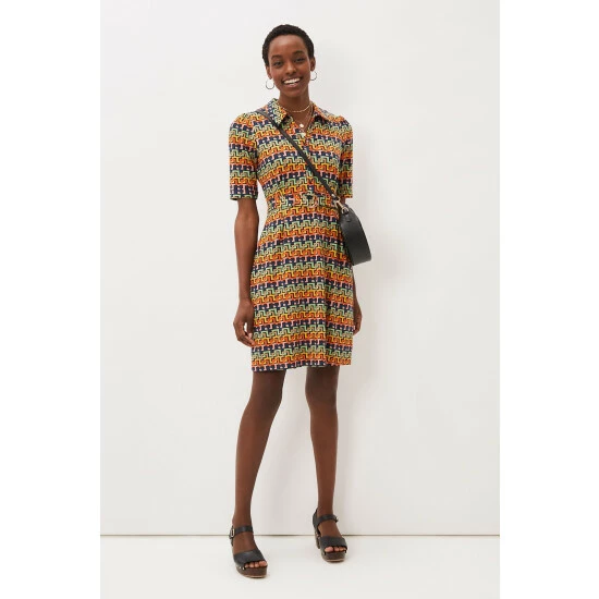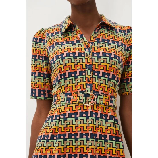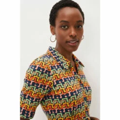 Make a statement this season in the Milano Geo dress. Designed in an eye-catching geometric print, this dress features a collared neck and belt detailing and falls just above the knee with short sleeves. They wear theirs with black heels and simple hoop earrings for a casual weekend look. Part of their Sustainably Sourced Collection. This style has been made from certified renewable wood sources. LENZING; ECOVERO; viscose uses a responsible production process, generating up to 50% lower emissions and water impact than generic viscose.