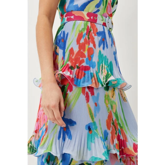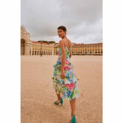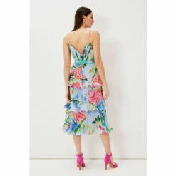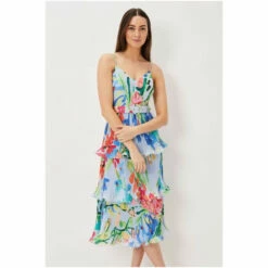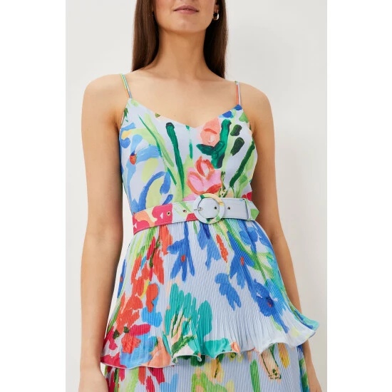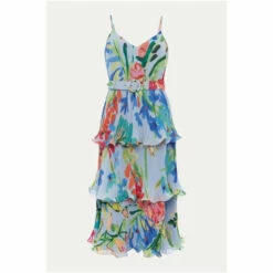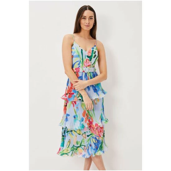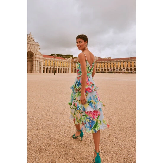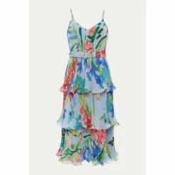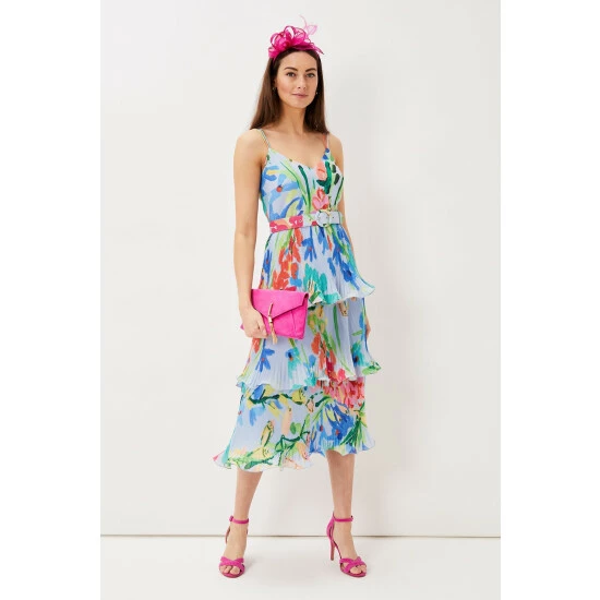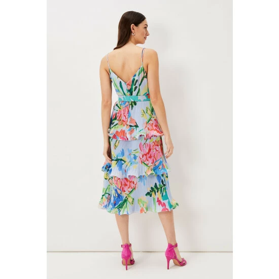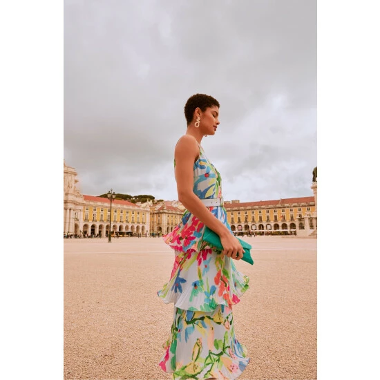 A floral staple this summer, our River dress is the perfect way to add colourful florals to your occasionwear wardrobe. With a flouncy tiered design and feminine V-neckline, our dress features delicate spaghetti straps and a matching covered belt to cinch in the waist, creating a stunning silhouette. We pair ours with bright pink heels for the perfect event-ready look.