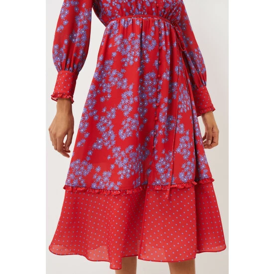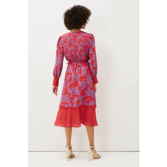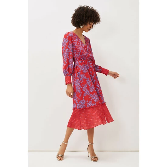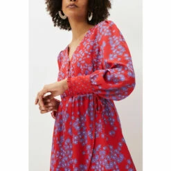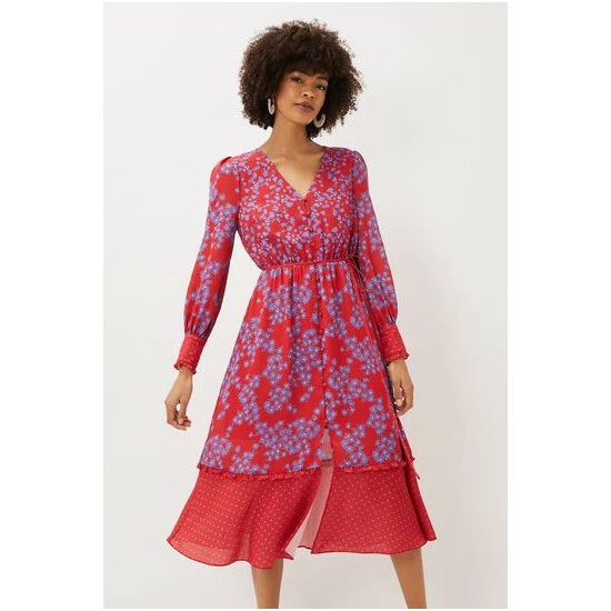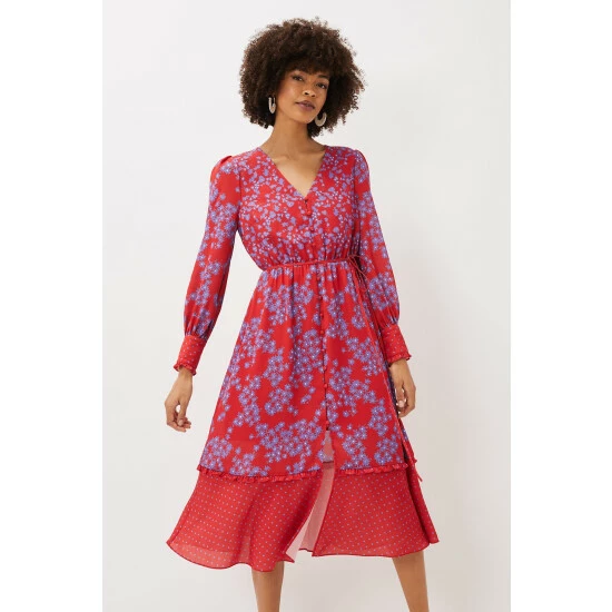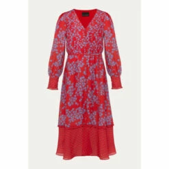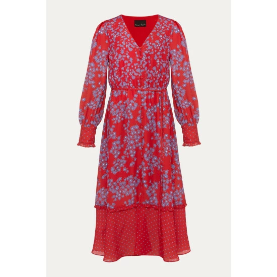 Make a statement at your next special occasion with this vibrant floral dress. Designed in a bright red shade with a contrasting purple floral print, this style is finished with a spot print hem and sleeve cuffs. Framed by blouson sleeves and a button through bodice.