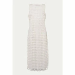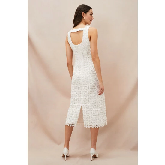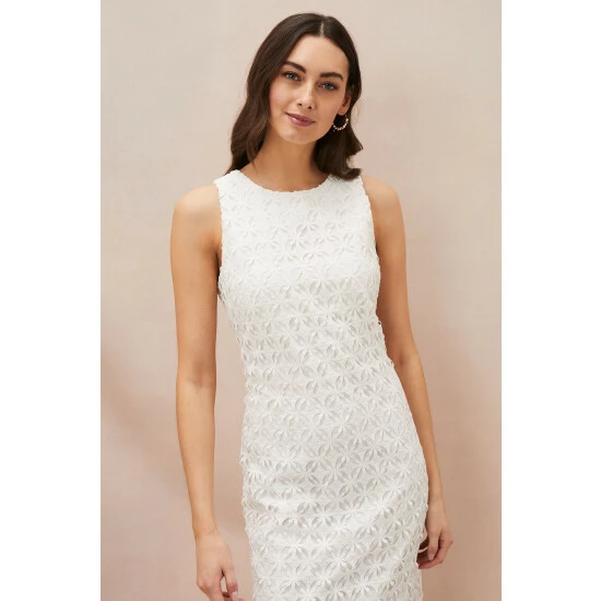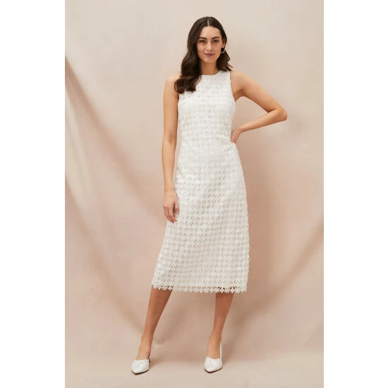 Inspired by the popular 60s shift silhouette and designed in lace throughout, our Novah Dress is a truly stunning style. Cut to a midi length, this sleeveless style showcases an intricate lace overlay that demands a closer look. A fabric T-bar at the back finishes this occasion style that is perfect for your upcoming RSVPs, or even a modern wedding dress option. || Model wears UK Size 10 and is 5 9″/175cm