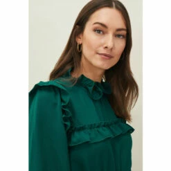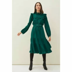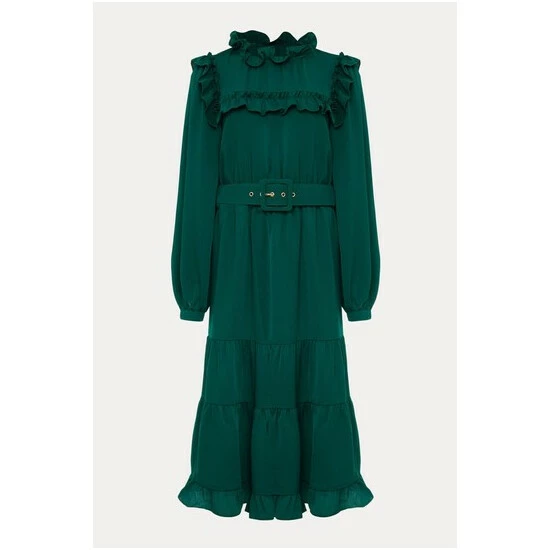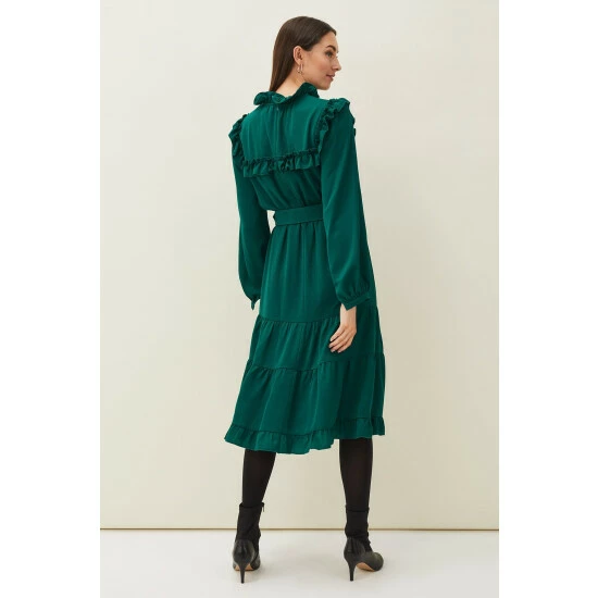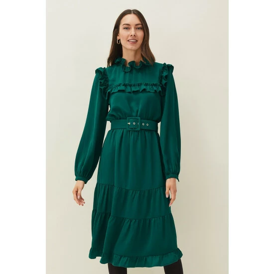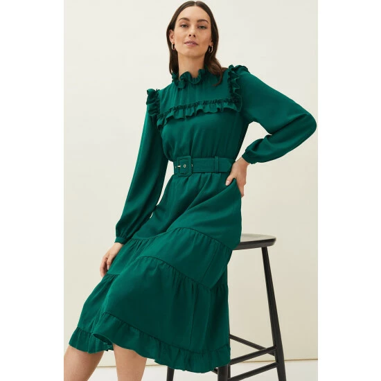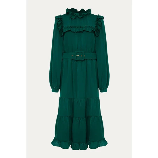An elegant and modern occasion dress that demands to be worn to your events this season. Designed in a deep emerald green shade, this style is framed by dramatic frill and tiered details, plus a defining buckle belt with contrast gold hardware.