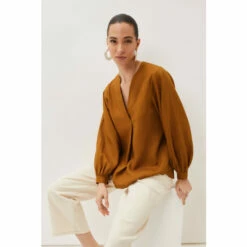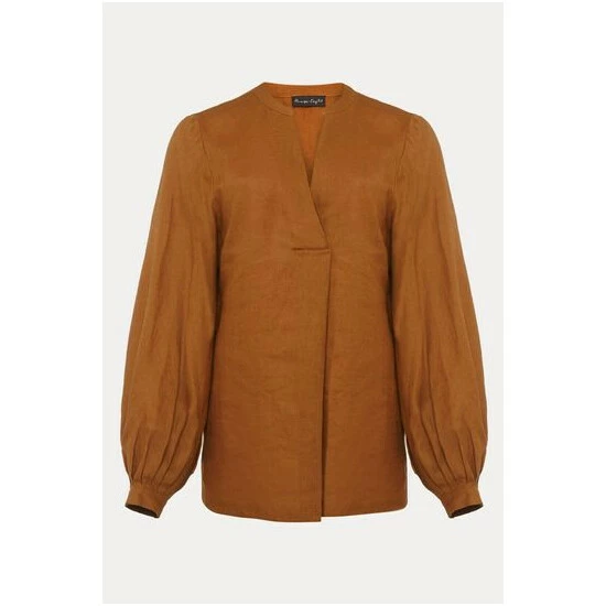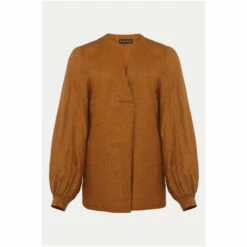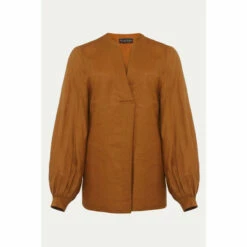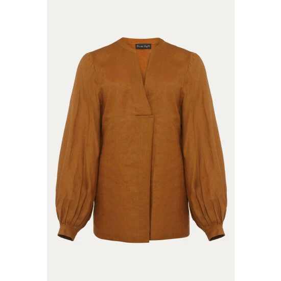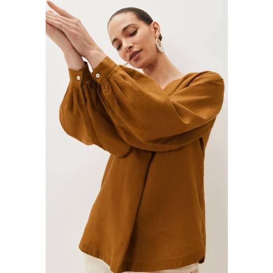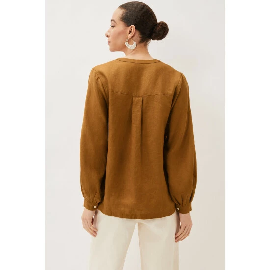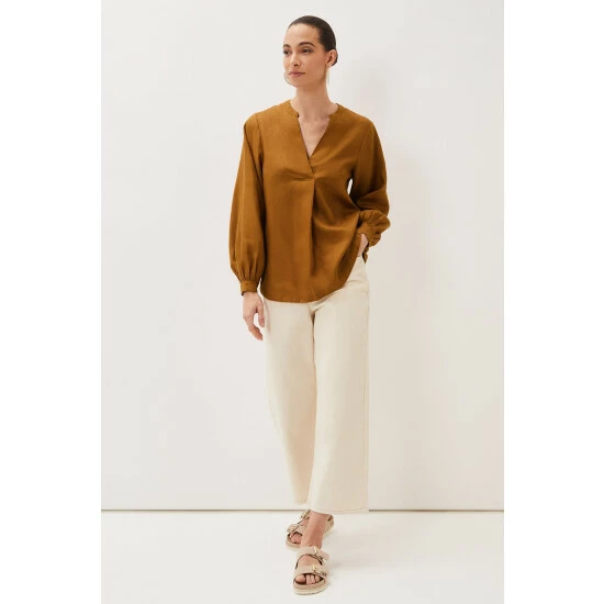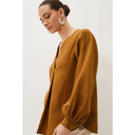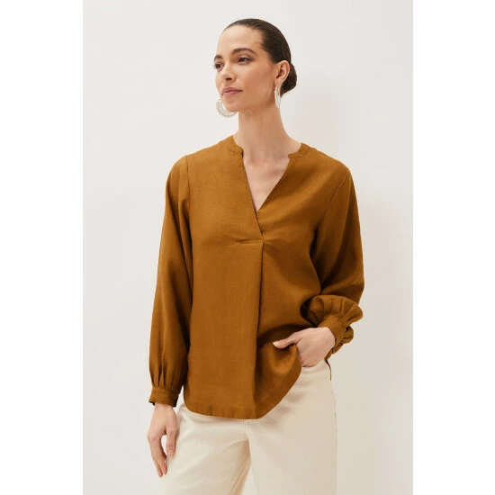 Simple and stylish, the 100% linen blouse is an easy way to make any outfit look polished. In a bold colour with a flattering V-neckline that falls to an inverted pleat and blouson sleeves that come to a neat, pleated cuff. This is a beautiful blouse that you will continue to reach for throughout the year.