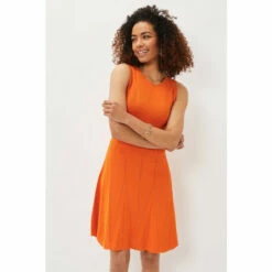 A new, contemporary style for them that is sure to brighten up your everyday wardrobe. Their sleeveless dress features a sunny orange shade, slim fit silhouette with an A-line skirt and has stitch detailing down the dress. Just slip on your sandals for a bright, warm weather look.
