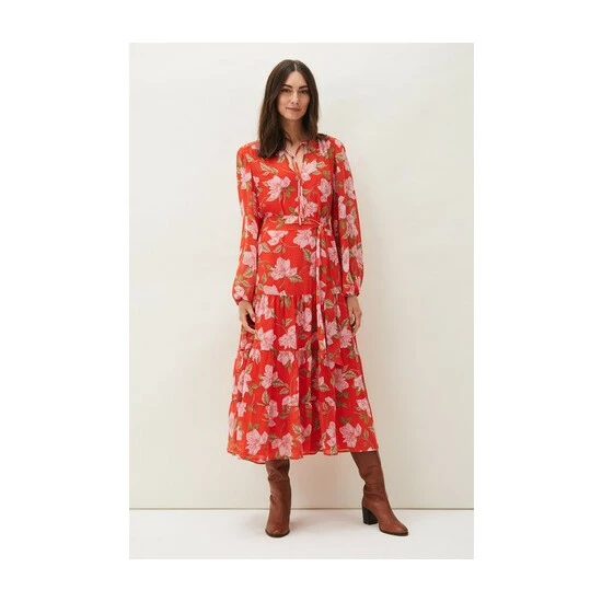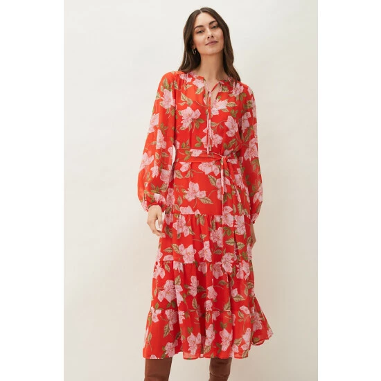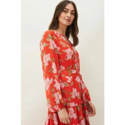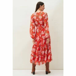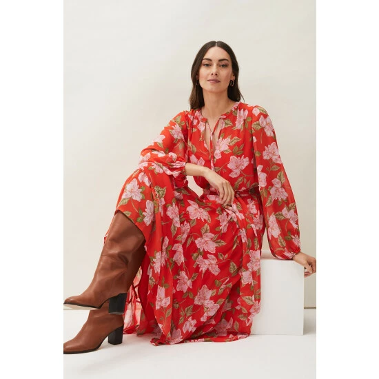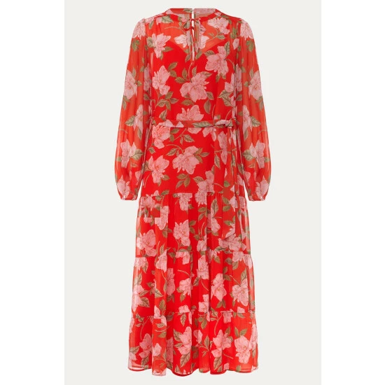 A gorgeous occasion dress to be seen in; this Philippa style is designed in a rich saffron red shade with eye-catching florals for a summer-ready finish. Other style notes for this striking dress include blouson sleeves, a peplum hem and keyhole detail on the bodice.