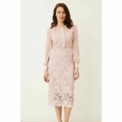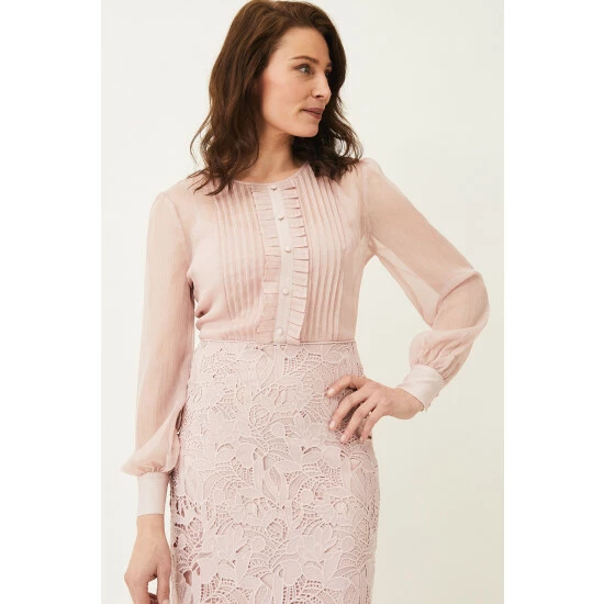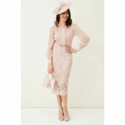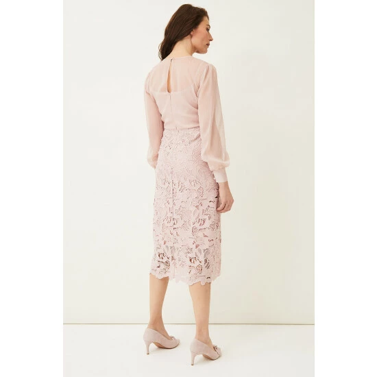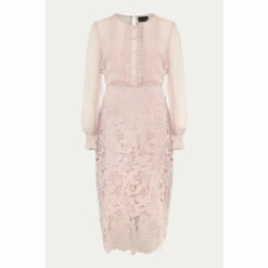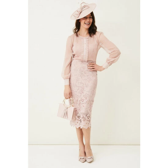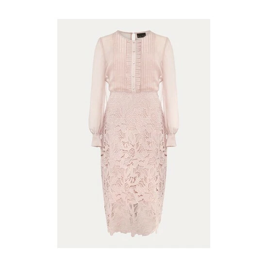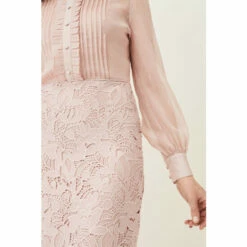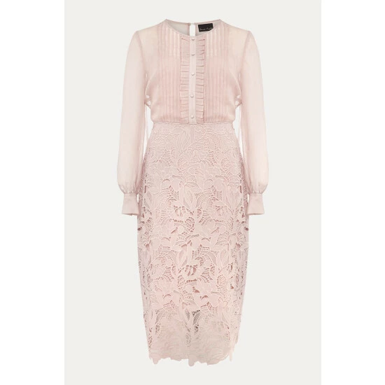 The Aldora Dress is all about the details. Designed with a semi-sheer pintucked bodice and a contrasting floral lace midi skirt. This style is framed by semi sheer blouson sleeves. Perfect for future spring/summer RSVPs.