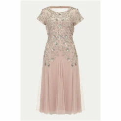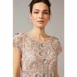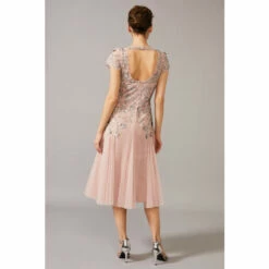 From Collection 8, our stunning range of premium evening dresses. Our Celia dress is a short occasion style that falls just below the knee, embellished with intricate cascading florals from the neckline and sleeves, down to the romantic tulle godets.