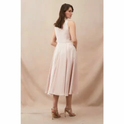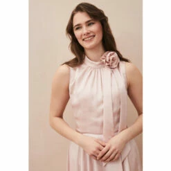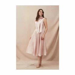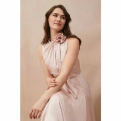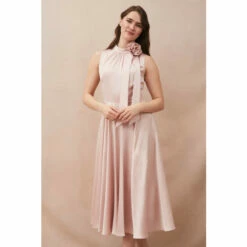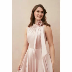 Designed in high-shine satin, this halterneck occasion dress falls into a softly pleated skirt that finishes below the knee. Ruching on the bodice and a floral corsage detail add extra statement to this style which is perfect for bridesmaids or special events such as prom.