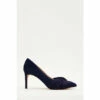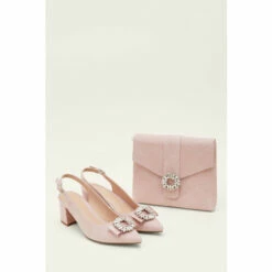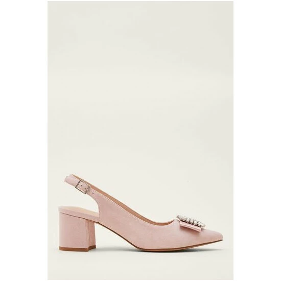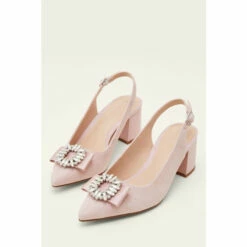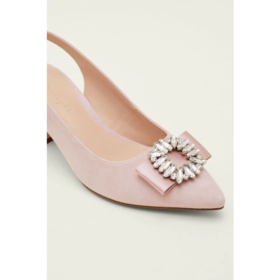 These slingback occasion heels are designed with a crystal embellishment atop a ribbon detail on the pointed toe.