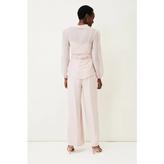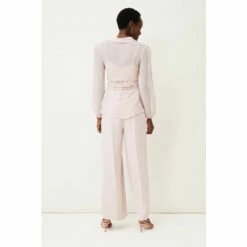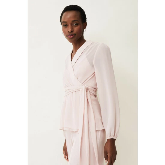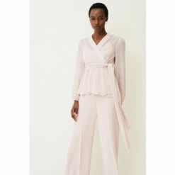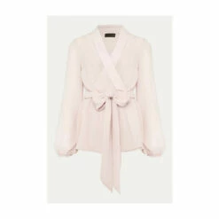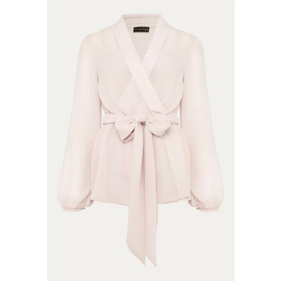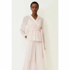 For a more contemporary take on occasion dressing, look no further than this Florentine co-ord. Designed in a soft shade of antique rose, this matching set features a semi-sheer wrap top with long blouson sleeves and oversized waist tie.