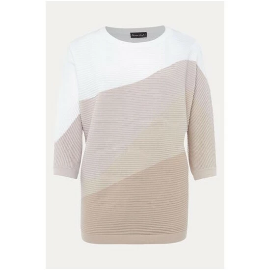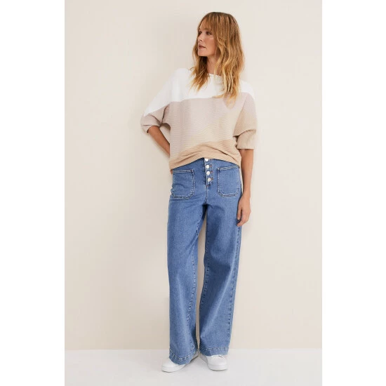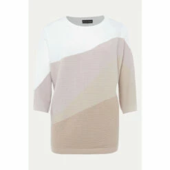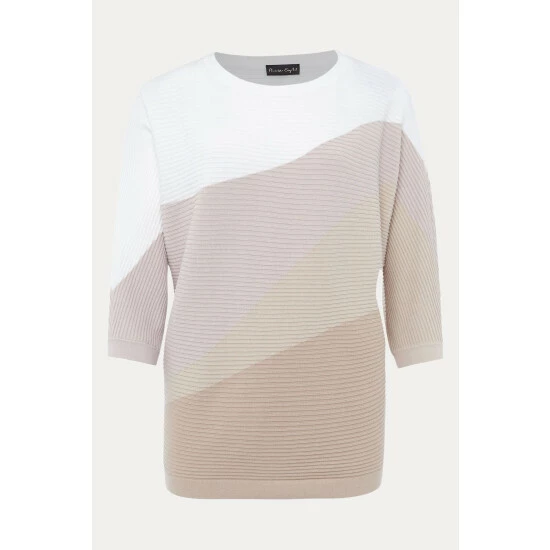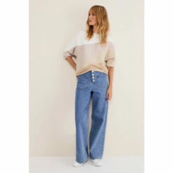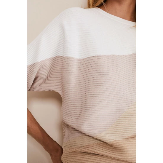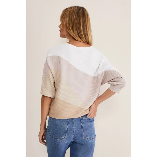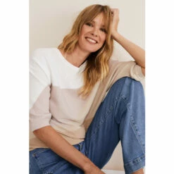 An effortless jumper to add to your wardrobe. Designed with contemporary colourblocks, our ribbed jumper features 1/2 sleeves and a fairly loose silhouette. We wear ours with wide leg jeans and white trainers for a look that’s perfect for the weekends.