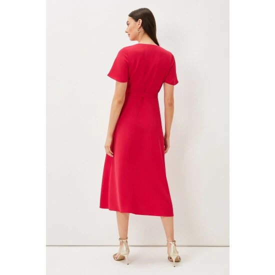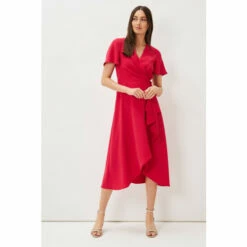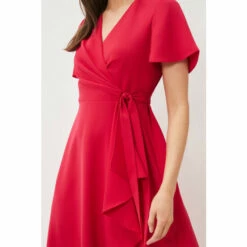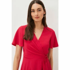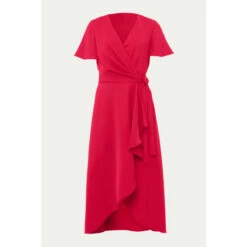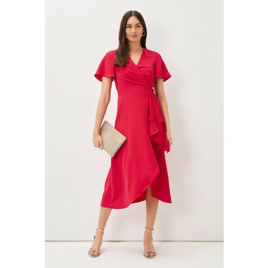 A layered frill hem adds impact to this elegant pink wrap dress, which is framed by softly fluted sleeves, and is finished with a matching waist tie to highlight your silhouette. Perfect for your future RSVPs.