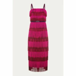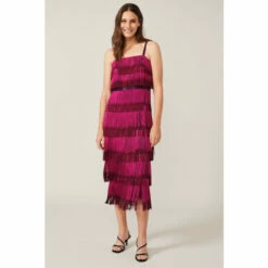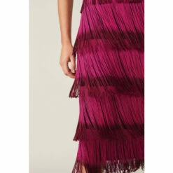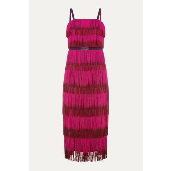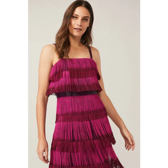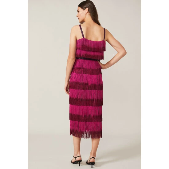 A dress we can’t wait to dance around our living room in. This stunning party style is full of movement thanks to the tiered dip-dye fringing, complemented by a beaded belt and straps.