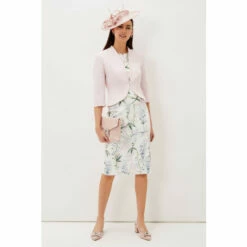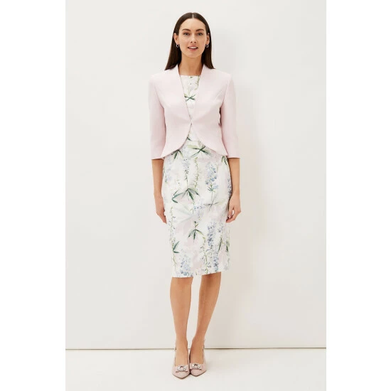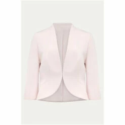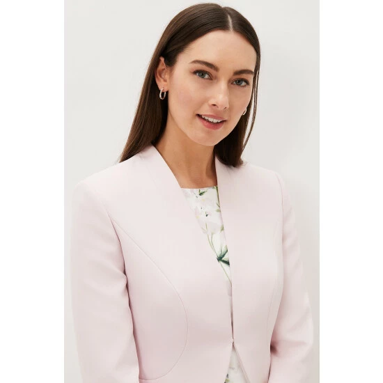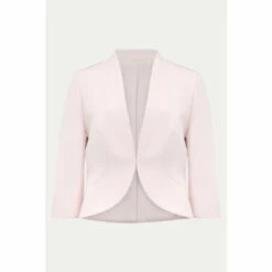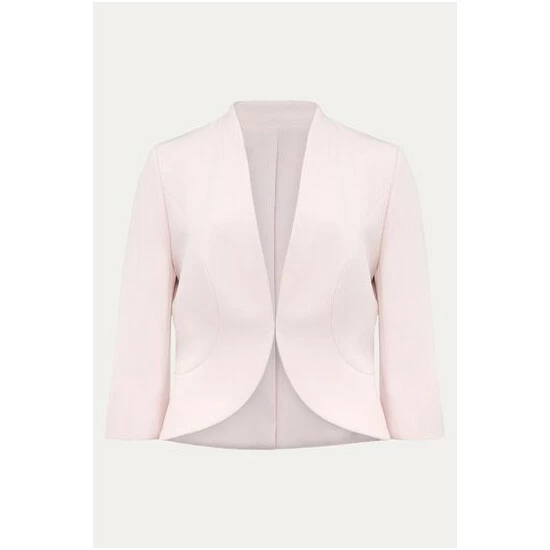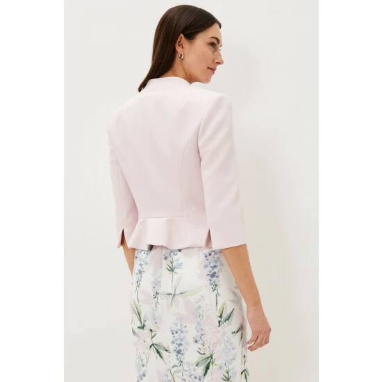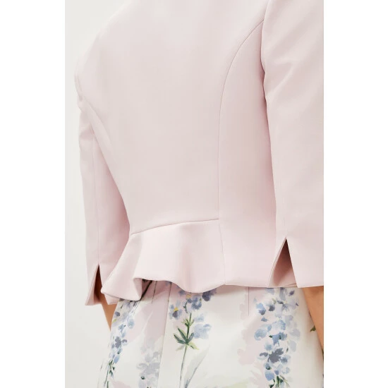 Add the finishing touch to occasionwear with this fitted open front jacket they love the contemporary peplum hem at the back.