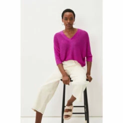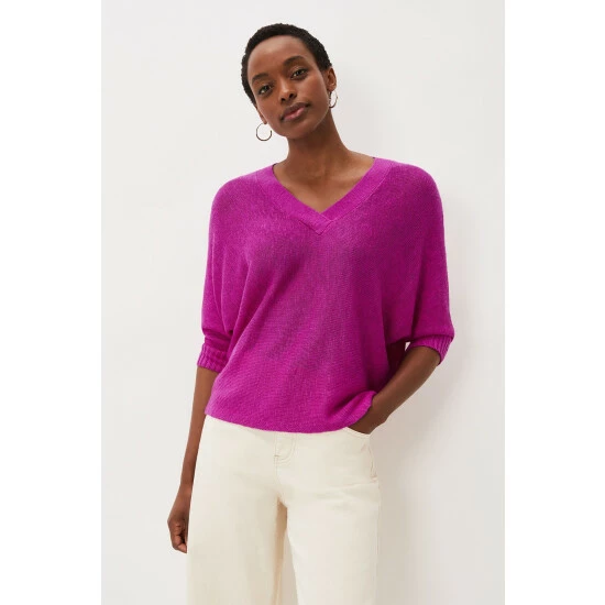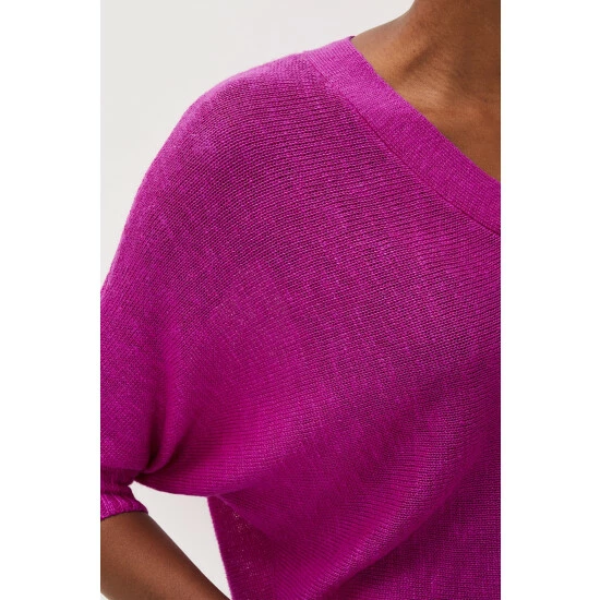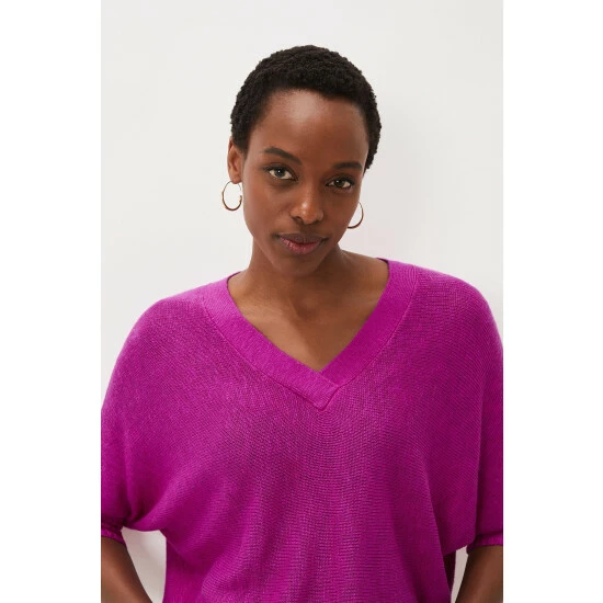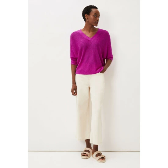 Spring into the new season with their colour-pop top. Crafted from the most stunning purple linen-rich fabric, their top is designed with a flattering wide V-neck and batwing cropped sleeves. They pair theirs with ecru wide leg jeans but the beauty of this top is its versatility to be paired with anything in your wardrobe.