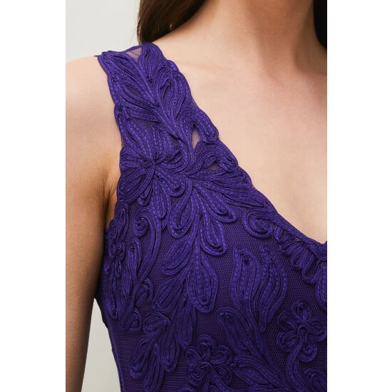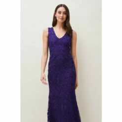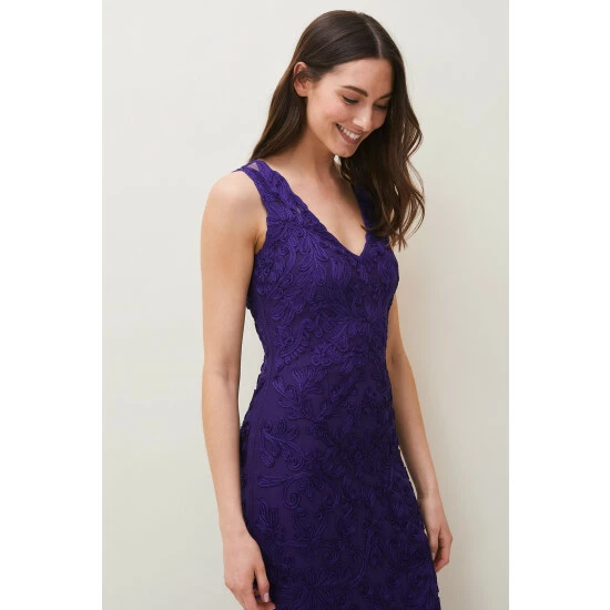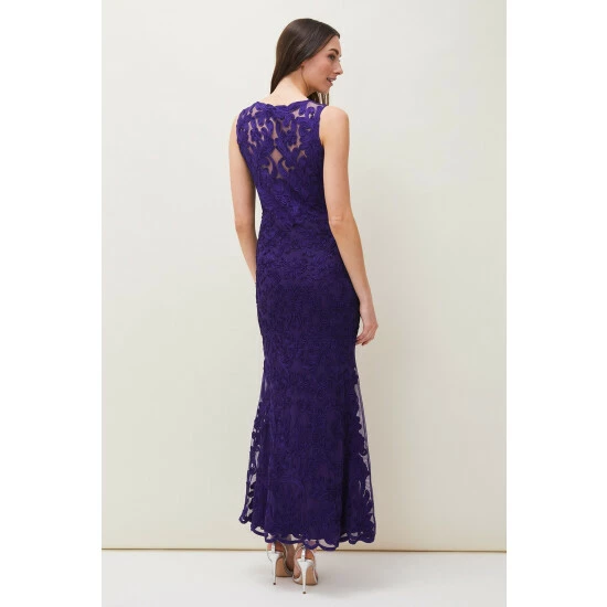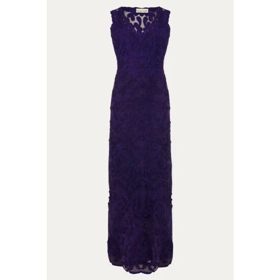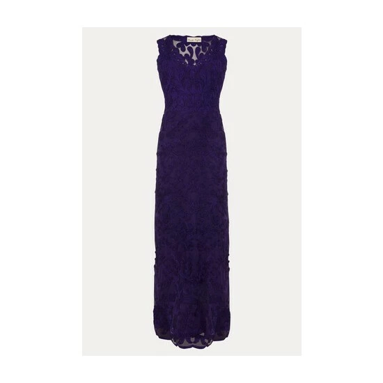From Collection 8, our stunning range of premium evening dresses. Designed in our signature tapework lace, our Osanne Dress is a perfect choice for your future black-tie events. This sleeveless full length style features a sheer back, V-neckline front and fishtail hem. Style with our coordinating violet accessories.