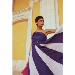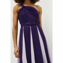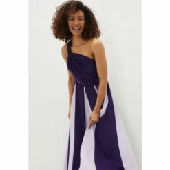 An elegant occasion jumpsuit for your upcoming events. Designed with a one shoulder pleated knot detail, our Rosalee jumpsuit has a slim fit bodice with a matching belt that comes down to a full skirt with stunning contrast panels. This jumpsuit will be a perfect modern option for wedding guest style, taking you from ceremony to dance floor in an instant.