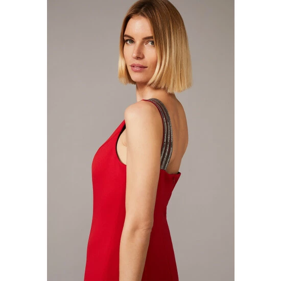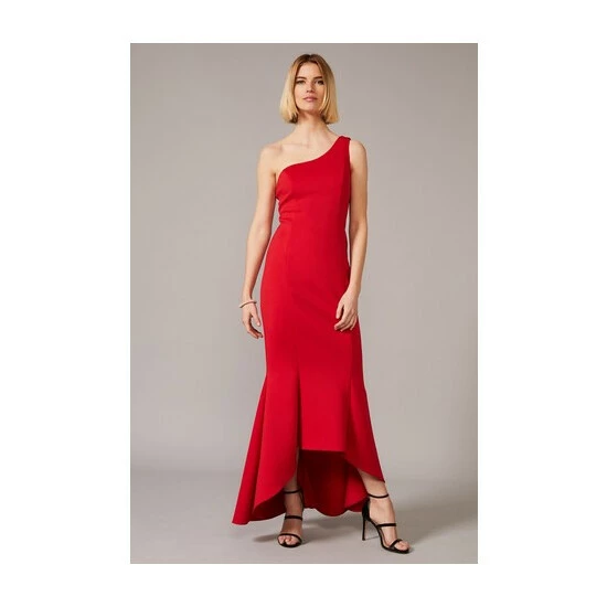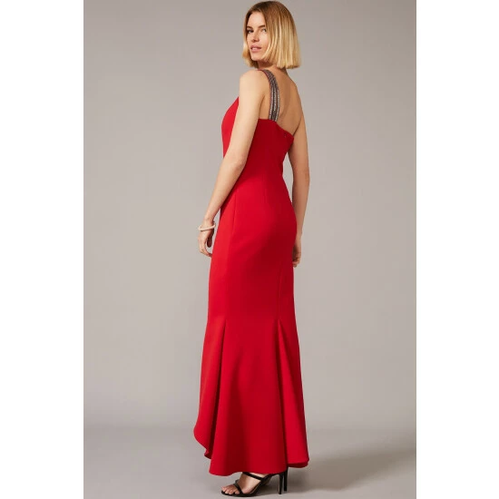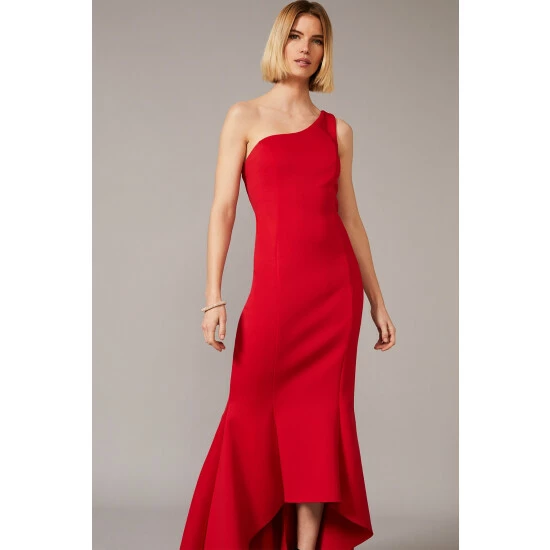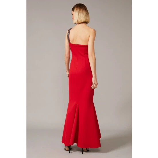 From Collection 8, Phase Eight’s stunning range of premium evening dresses. The best way to stand out from the crowd? Wear red. The striking Dahlia dress is designed in a one shoulder silhouette from soft scuba fabric that sits close to your body. With a beaded strap running down the back and seaming through this style to contour your shape. A fishtail drop hem adds dramatic flair to this style that’s perfect for parties and black tie events.