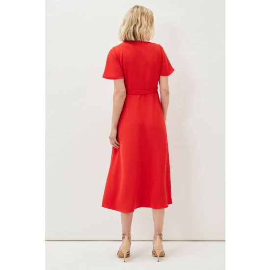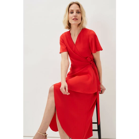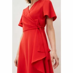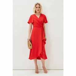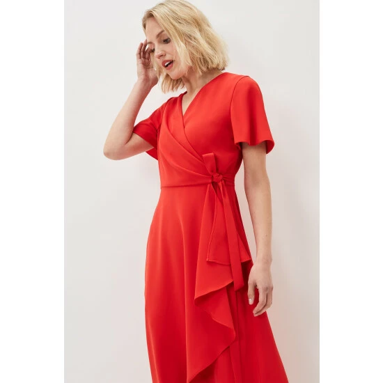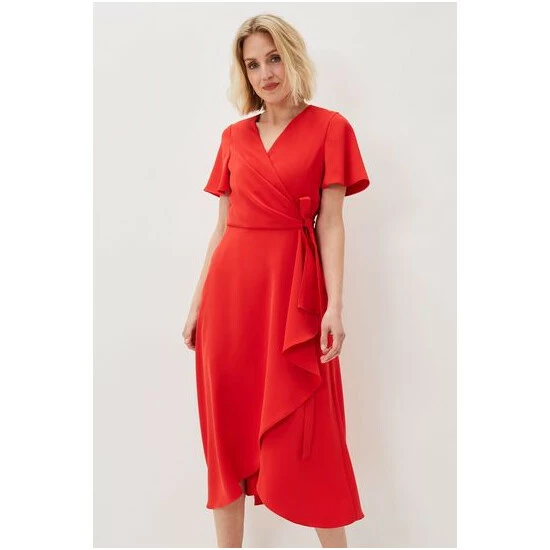 A layered frill hem adds impact to this elegant colour-pop wrap dress, which is framed by softly fluted sleeves, and is finished with a matching waist tie to highlight your silhouette. Perfect for your future RSVPs.