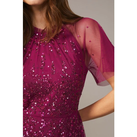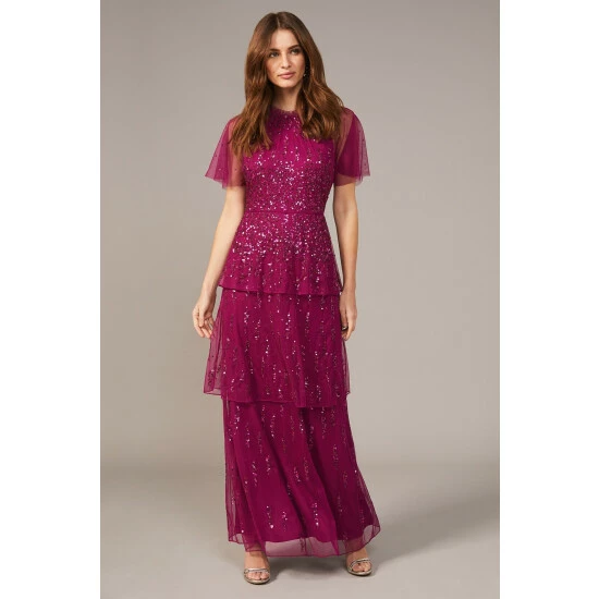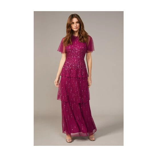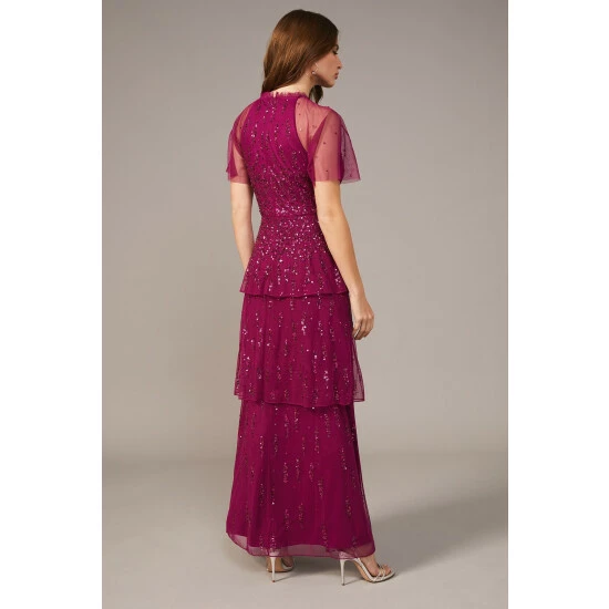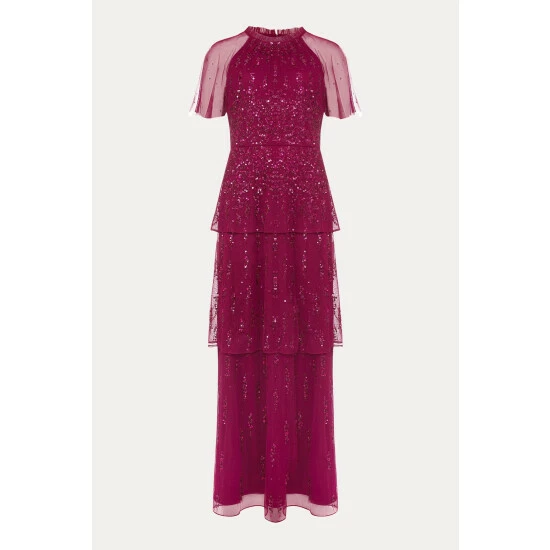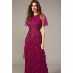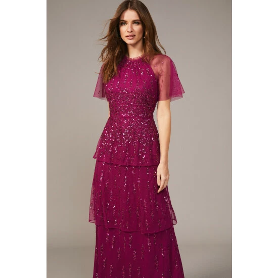 From Collection 8, Phase Eight’s stunning range of premium evening dresses. Tiered for a romantic silhouette, this floor length style is embellished with eye-catching sequins from top to toe, with short, semi-sheer sleeves and a high neckline adding a contemporary finish to this beautiful evening dress.