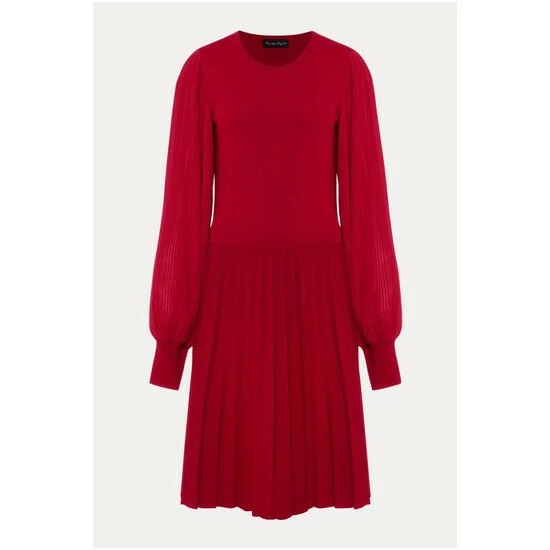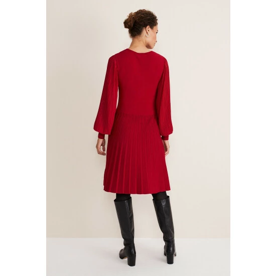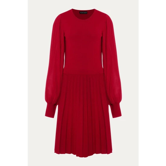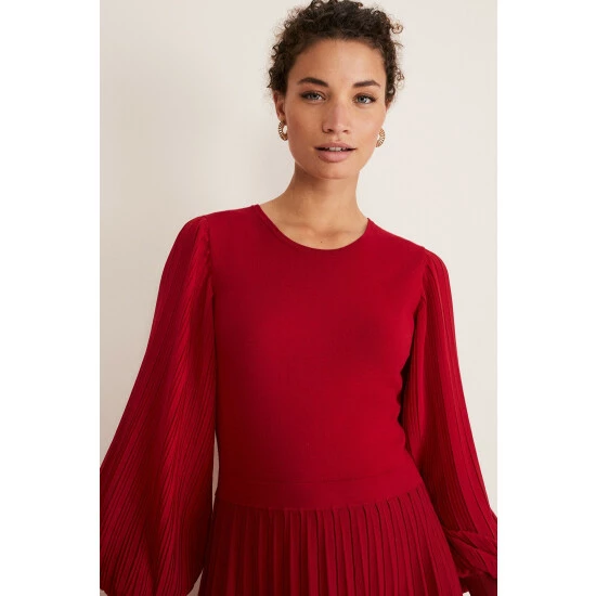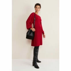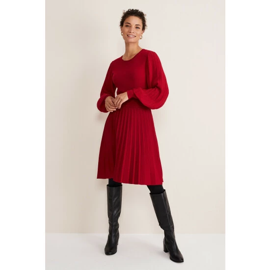 A new style to add to your everyday wardrobe. Our knitted dress is designed in a stunning deep red shade and features blouson pleated sleeves as well as a fully pleated skirt. We wear ours with knee-high boots for desk-to-dinner style. This style is responsibly sourced. This style has been made from certified renewable wood sources. LENZING™ ECOVERO™ viscose uses a responsible production process, generating up to 50% lower emissions and water impact than generic viscose. LENZING™ and ECOVERO™ are trademarks of Lenzing AG.