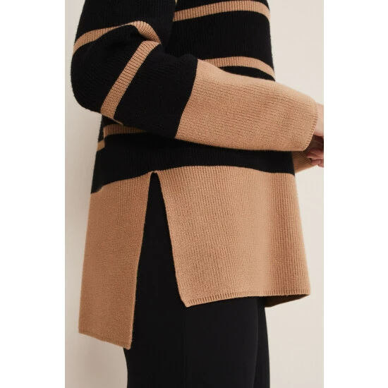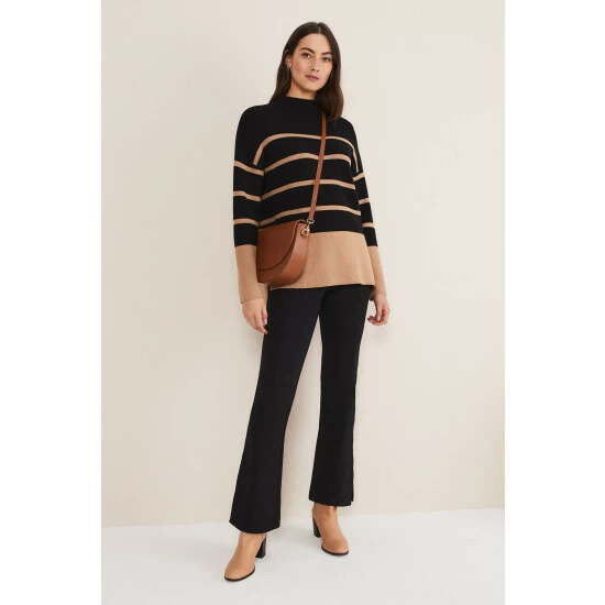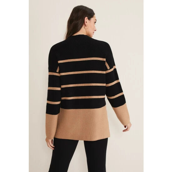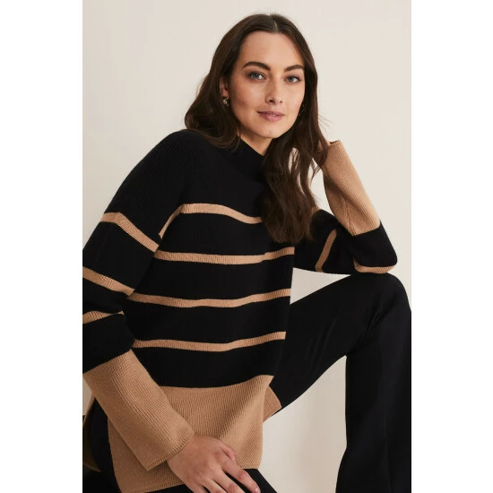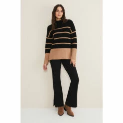 A style to add to your staple wardrobe. Designed in a timeless black and camel colour palette, our Romy jumper features a classic striped design, high neck and long sleeves. We wear ours with jeans for a casual weekend look.