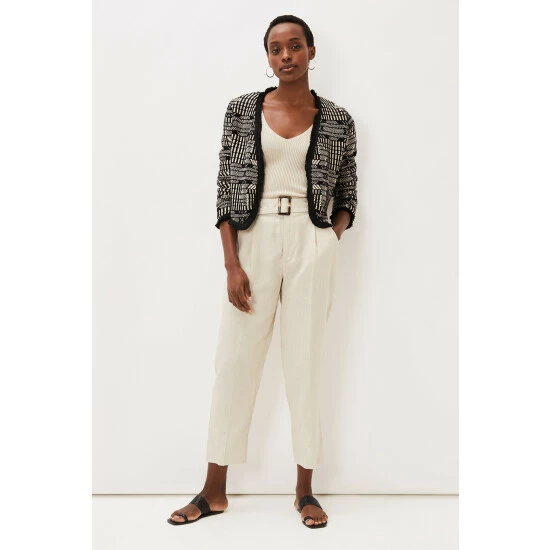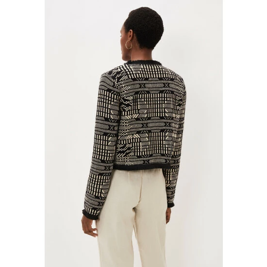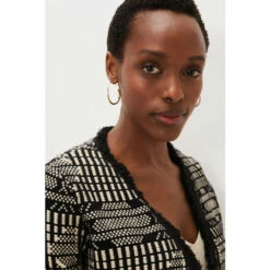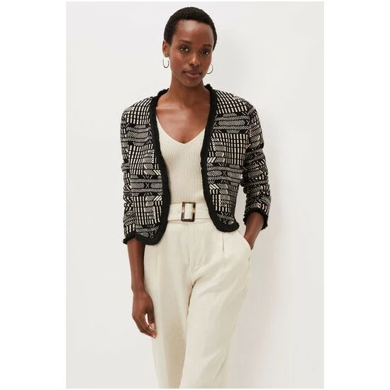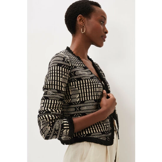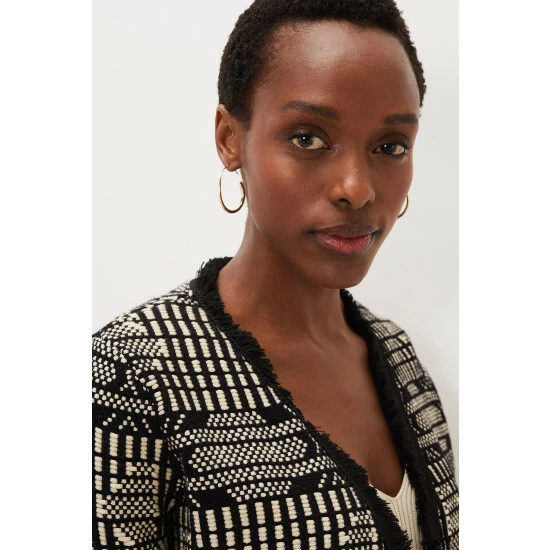 The perfect jacket to layer over all your spring/summer outfits. Crafted from 100% cotton, this jacket designed in a rich Ikat print features a black decorative tassel hem.