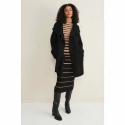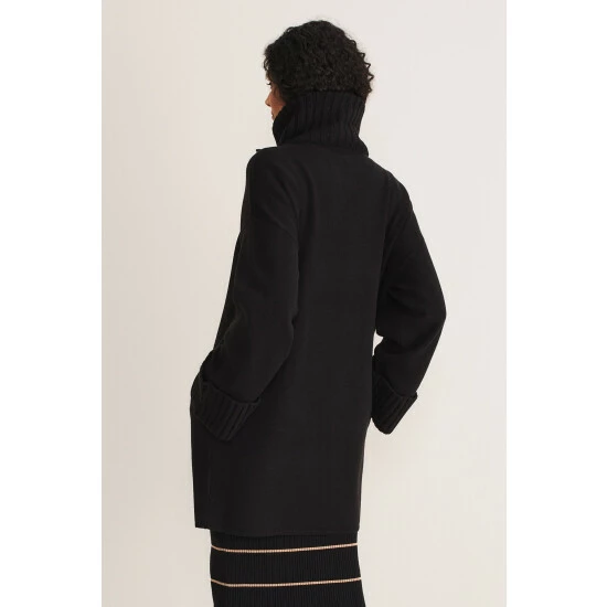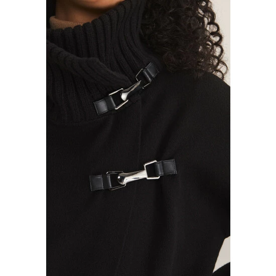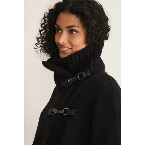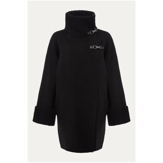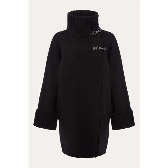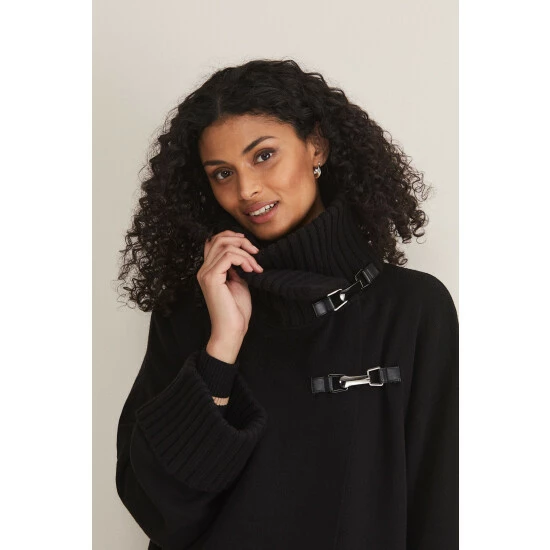 Your new go-to coat. Designed to a cape-style shape with a cosy high neck knit, our versatile black coat features contemporary buckle detailing for a stylish finish.