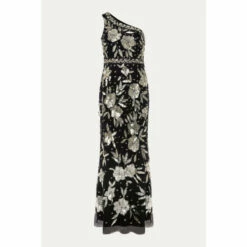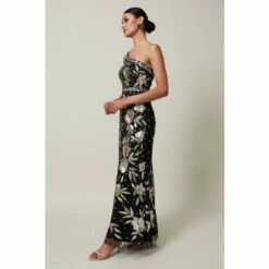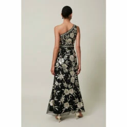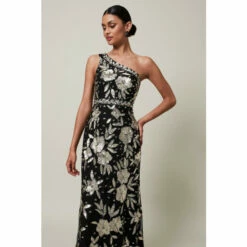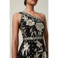 Part of Collection 8, our premium range of evening occasion styles. Our Serafina black dress is designed with all-over floral sequin embellishment that makes this a truly standout style. Sweep your hair up to show off this beautiful asymmetric neckline. We wear ours with gold heels and earrings.