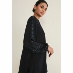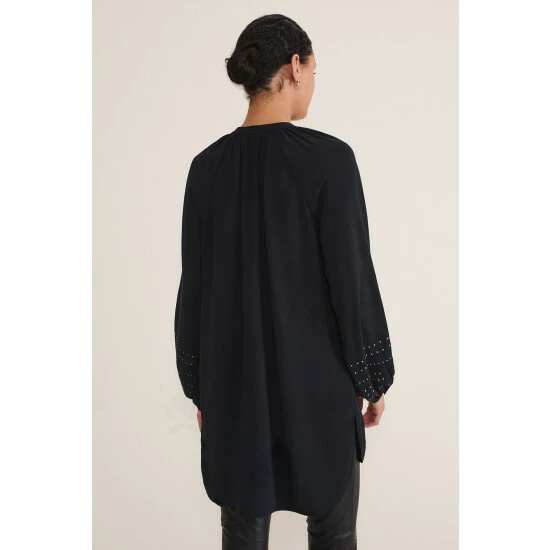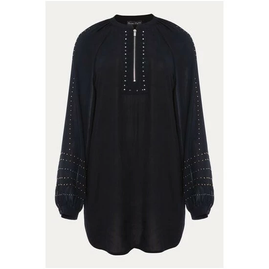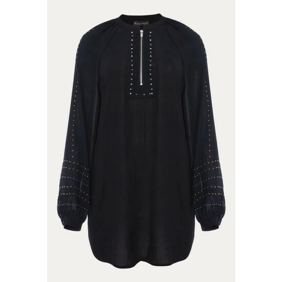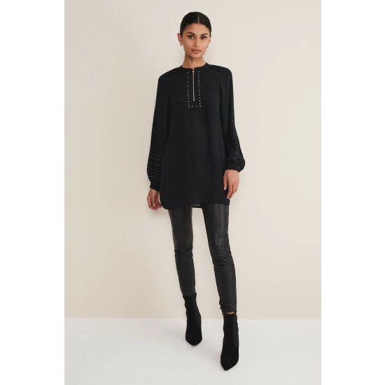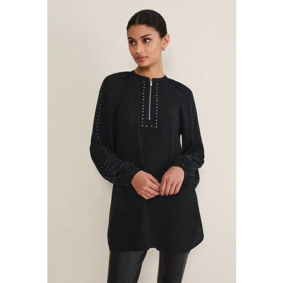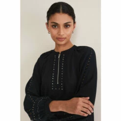 An effortless blouse to add to your everyday wardrobe. Designed in a versatile black shade our Tallulah blouse features stud and zip-up detailing. We wear ours over leather look trousers and boots for a stylish weekend look.