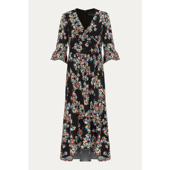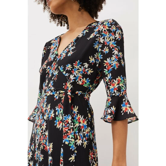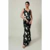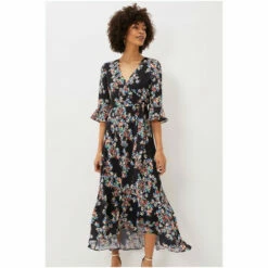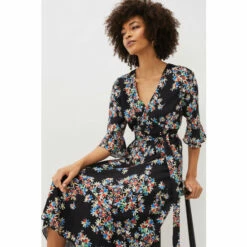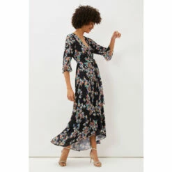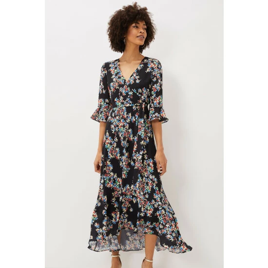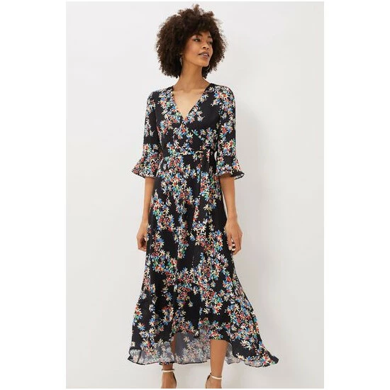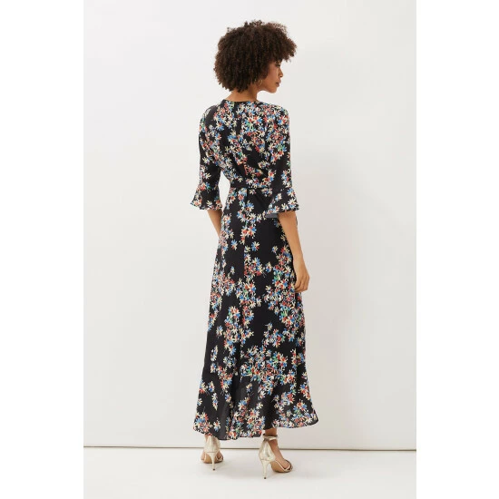 Make a statement in this modern floral maxi dress, completed with fluted sleeves and a waist tie for an elegant finish.