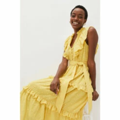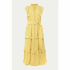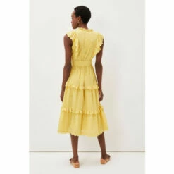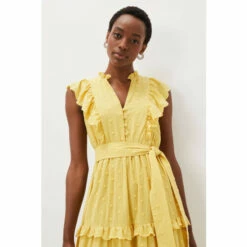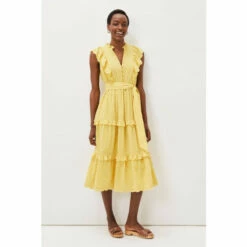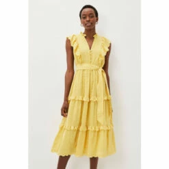 The perfect dress to brighten your day. Designed in a sunny yellow shade, our Parissa dress features dobby detailing, a feminine V-neckline that’s framed with frill details to match the tiered, frill skirt. This style is complete with a self-tie waist belt so you can accentuate your waist. Slip on clogs or sandals for a stunning day look.